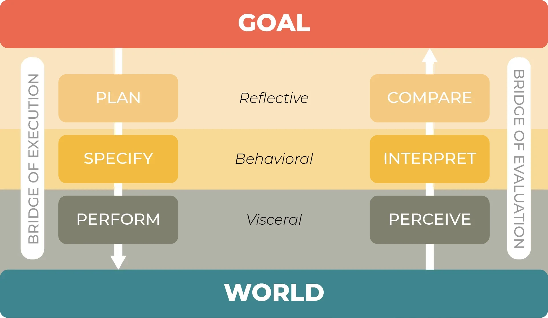 When we use an object, we encounter two gulfs: the Gulf of Execution, where we try to figure out what to do, and the Gulf of Evaluation, where we strive to understand what happened. The designer’s task is to help users bridge these two gulfs and make them as shallow as possible. According to Norman, all these phases are experienced and lived through by three types of mental processing: the visceral brain, which is the most basic, reactive, and subconscious; the behavioral brain, which houses skills learned in circumstances similar to the current ones (thus guided by expectations); and the reflective brain, the place of conscious cognition, decision- making reasoning, and higher-level emotional processing, such as satisfaction, frustration, guilt, etc.